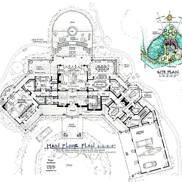 Featuring a 28′ high great hall, a “crows nest” observation tower, a home cinema, and a well-appointed outdoor cooking and dining terrace, the use of native stone and wood shingles ensures long life and harmony with its surroundings.