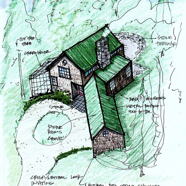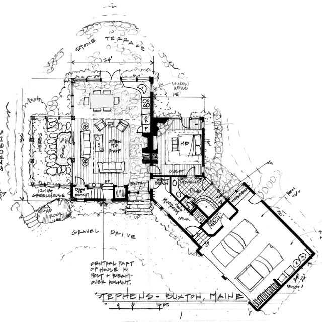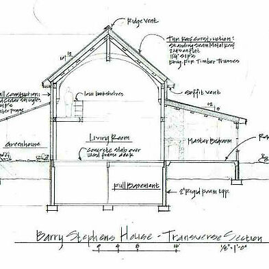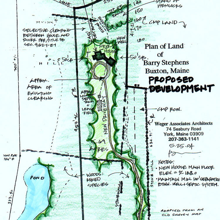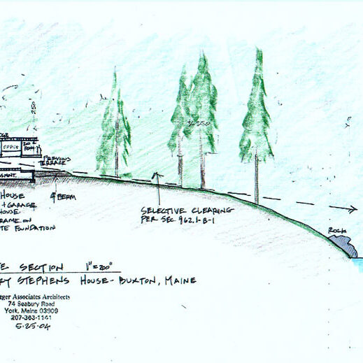 This home, currently under construction, was designed as an environmentally sensitive home on a lake in the Maine woods. It is meant to harmonize with the land while leaving the beauty of its surroundings undisturbed with features like post and bream framing, hydrothermal heating, good southern exposure, and natural wood and stone materials.